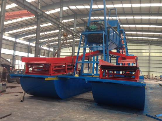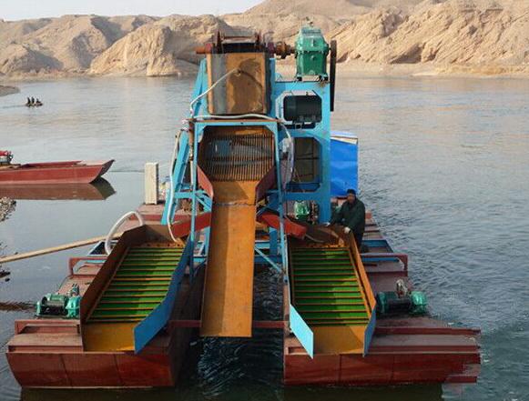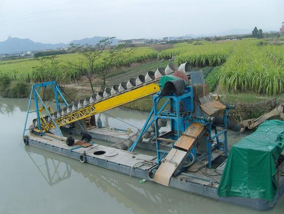 溜槽淘金船是目前使用率比較廣的淘金船,溜槽可以有幾種選擇比如:蠕動溜槽、鼓動溜槽、振動溜槽、循環(huán)溜槽、固定溜槽等??梢愿鶕?jù)黃金形態(tài)進(jìn)行配套。淘金船的產(chǎn)量和回收率可以根據(jù)客戶的要求定制。